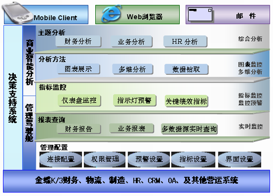金蝶K/3决策支持管理解决方案是帮助企业决策的优化工具和分析手段,通过优化日常事务处理数据,及时获取企业实际运营数据,提供准确、及时、科学并且多视角、多维度的决策分析数据,方便决策者及时了解企业各个环节的运行状况,一目了然地得到企业关键绩效目标与实际经营指标的差异,及时发现企业经营中的异常,及时做出准确的决策,把握企业未来增长和盈利的机会。